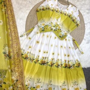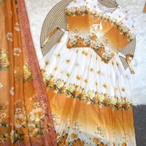 জর্জেট গাউন+ওড়না টু পিছ হলুদ কালার